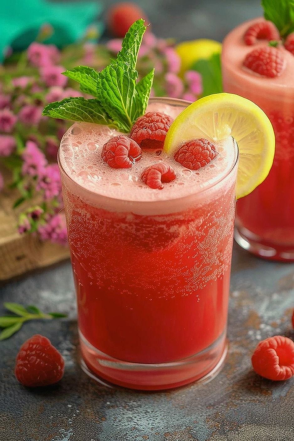 - 1. In a glass, muddle the fresh raspberries until they release their juices and form a puree-like consistency.2. Add the freshly squeezed lemon juice and honey to the glass, and stir well to combine.3. Fill the glass with ice cubes to your liking.4. Top off the mixture with sparkling water, pouring slowly to preserve the fizz.5. Give the drink a gentle stir to mix all the flavors together.6. Garnish with a sprig of fresh mint leaves for a touch of elegance and aroma.7. Serve and enjoy your homemade Sparkling Raspberry Lemonade Spritz!
